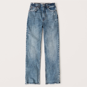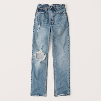Our 90's Straight jeans that are relaxed through the thigh with a straight leg and a slightly higher rise in our vintage stretch fabric and broken-in denim feel. Bring back a vintage feel in these Abercrombie & Fitch 90s Straight Leg Jeans featuring a high-rise waistline, built-in stretch and detailing.