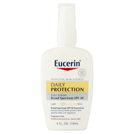 Age Defense Face Sunscreen SPF 50. Eucerin sensitive protect sunscreen for the face | Eucerin In stock for standard shipping. For combination and oily skin. Discover Eucerin 25 Age Defense Face Sunscreen SPF 50 Buy now 15 Oil Control Face Sunscreen SPF 50 Buy now 14 Advanced Hydration SPF 50 Sunscreen Buy now 20 Advanced Hydration Sunscreen Spray SPF 50 Buy now Explore Our Product Ranges 91 % AGREE THE CLEANSER IS GENTLE DURING APPLICATION *AFTER 2 WEEKS OF DAILY USE (N=35) Eucerin Sun Oil Control Face Protection SPF 50+. The innovative Advanced Spectral Technology combines broadband and photostable UVA and UVB filters for reliable UV protection with antioxidant Licochalcone A for high-energy visible (HEVIS) light defense. The Eucerin Eczema Relief Crme does not clog pores and it may be used on the face. We recommend that you try on small area to be sure you are not more sensitive on the face and avoid the eyes. Can I use Eucerin as a face moisturizer? For normal and dry skin. face sunscreen spf daily eucerin lotion protection oz fl With SPF 100 it provides very high UVB and UVA protection. EWG rating for Eucerin Age Defense Face Sunscreen Lotion, SPF Eucerin Age Defense Face Sunscreen Lotion - SPF 50 - 2.5 fl oz.