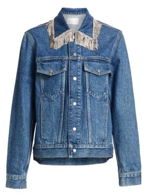 This denim jean jacket goes to new heights with this flashy rhinestone fringe throughout. The Glamour Girl White Rhinestone Fringe Denim Jacket is the perfect piece to add some edge to your look. 5 out of 5 stars. 4.5 out of 5 stars (712) $ 33.99. FREE Shipping. 5 out of 5 stars (3,385) $ 115.00 FREE shipping Add to superdown Raya Rhinestone Fringe Jacket in Light Blue Wash Features silver buttons down the front, a length that hits right at the hips, and side pockets. The TikTok Jacket but with real rhinestones and sewing method.