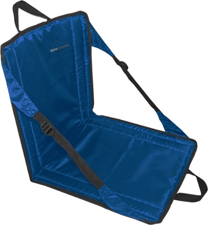 The alpine mountain gear stadium seat in Blue is constructed of durable rip stop with a fiberglass frame and foam padded seat and back rest that both provide comfortable support.