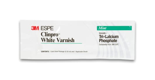 Comparative assessment of fluoride varnish andfluoride film for remineralization of postorthodontic white spot lesions in adolescents and adults over a 6-month period: A single-center, randomized controlled clinical trial. The varnish is painted onto the teeth, and can easily be divided into 0.25ml for primary dentition, 0.4ml for mixed dentition to 0.5ml for permanent dentition. 8600 Rockville Pike Dosage guide on the back of the foil pouch and dosage stickers contained in the pack provide a quick and accurate determination of the appropriate dose. Clinpro White Varnish with Tri-Calcium Phosphate (TCP)Clinpro White Varnish with TCP (Tri-Calcium Phosphate) is a proprietary formula that contains fluoride, calcium and phosphate-components naturally found in saliva. 0000003623 00000 n