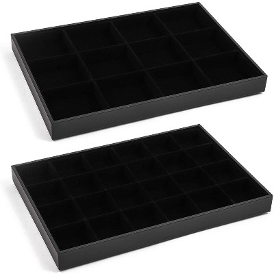 Interior. grids DIMENSIONS - Exterior: The Tray measures 7 Inches wide 7 Inches in the length and 2 Inches in the height. Interior compartments: 32 squares 1 x 1 inches. Eighteen compartment jewelry tray liner is an affordable way to store and organize jewelry pendants or other similar sized items. Interior compartments: 8 rectangle 6 x 1 Inches. jewelry compartment organizer display case locking lid tray storage box Featuring a classy black velvet, these trays are sure to keep it classy. slots Find everything you need to organize and store your jewelry. These multi-purpose jewelry trays will keep valuables organized and protected for safe storage. Stacked trays slide from side-to-side to allow access to the lower trays. This item is eligible for return within 30 days of purchase.